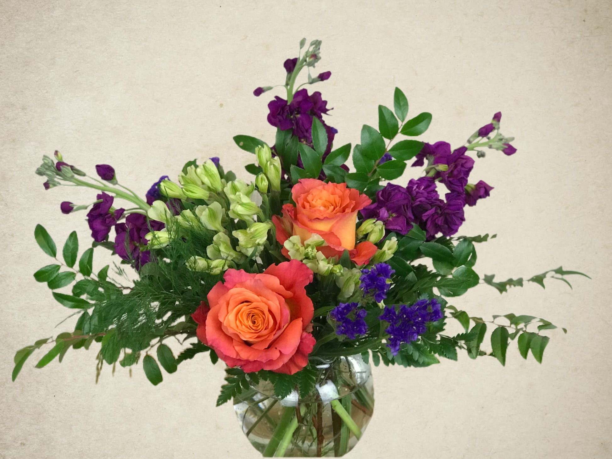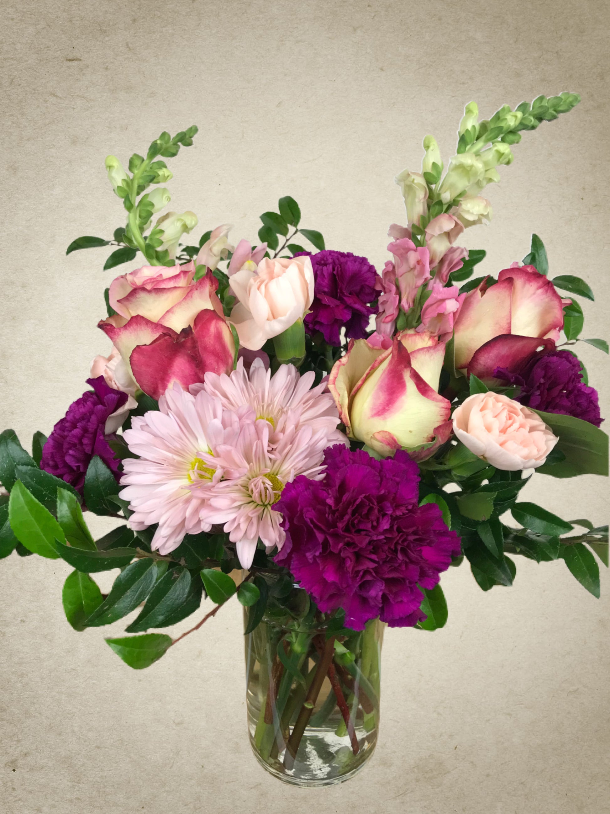 Exquisite coordinating blooms and classic foliage in glassware. Perfect for everyday and all occasions.
